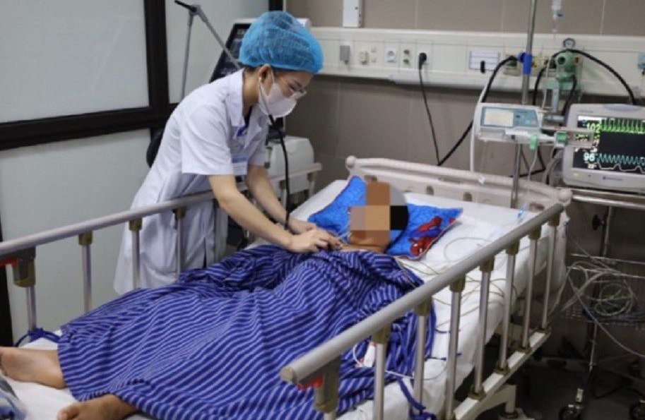 Khi nhập viện, trẻ rơi vào viện trong tình trạng sụp mi mắt, yếu tay chân, dấu hiệu liệt cơ hô hấp, thở khó khăn, liệt hầu họng. Các bác sĩ nhanh chóng đánh giá, cấp cứu, đặt ống nội khí quản cho bệnh nhi thở máy.
