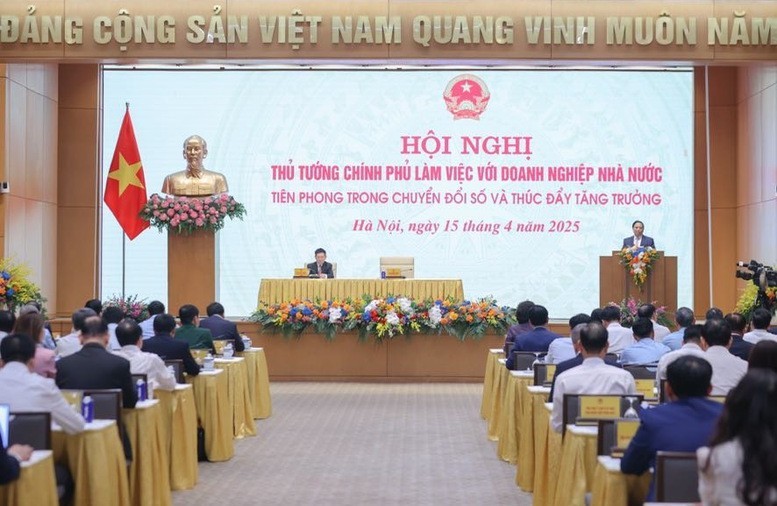 Sáng nay, 15/4, tại trụ sở Chính phủ, Hội nghị Thủ tướng Chính phủ làm việc với các Chủ tịch, Tổng giám đốc một số Tập đoàn, Tổng Công ty Nhà nước được tổ chức với chủ đề: Doanh nghiệp Nhà nước tiên phong trong chuyển đổi số và thúc đẩy tăng trưởng.