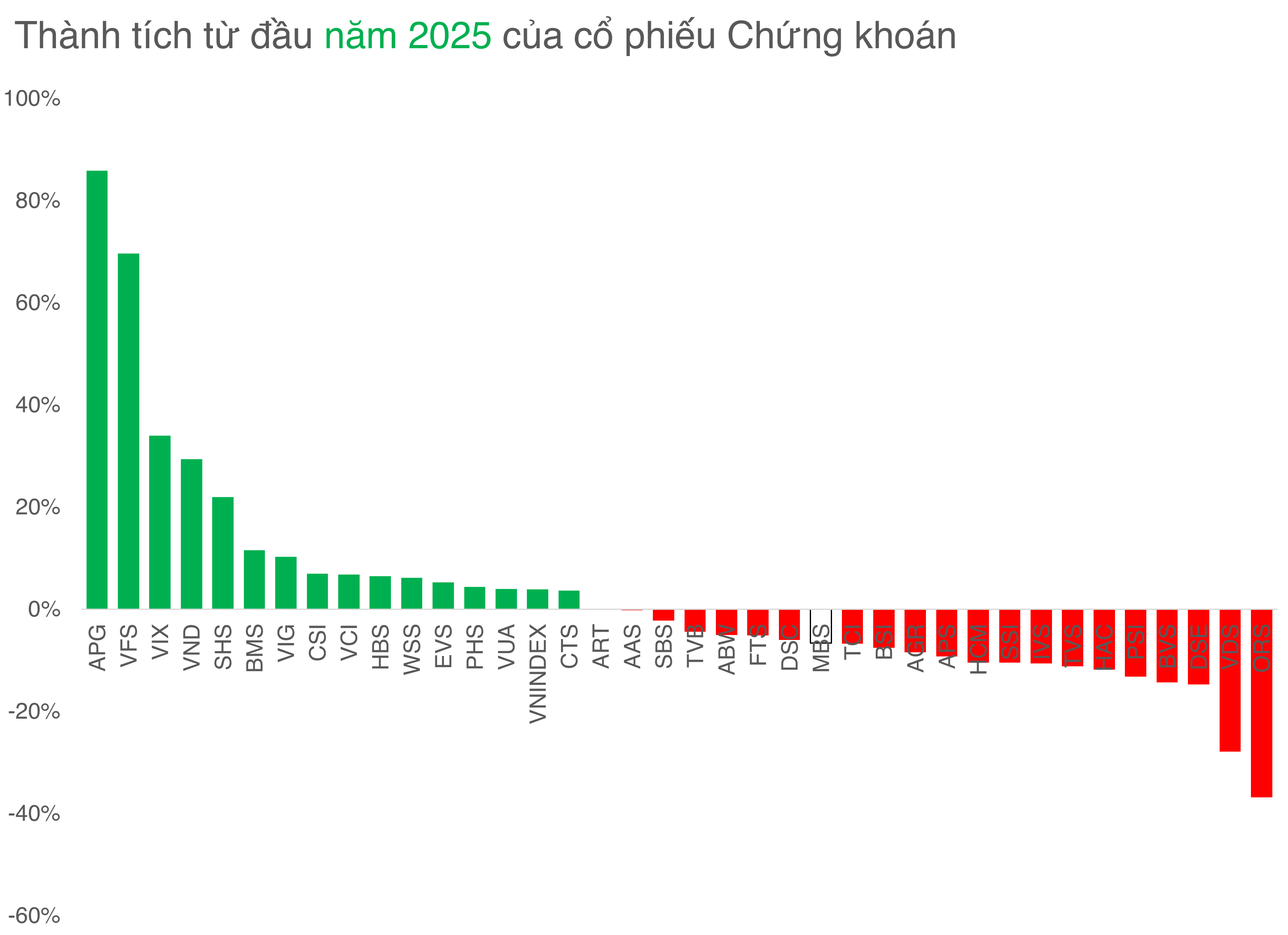 Cổ phiếu VFS vừa có một phiên tăng 10% qua đó nâng thành tích giá từ đầu năm 2025 lên 69,7%, đứng thứ 2 trong ngành xếp sau cổ phiếu APG của Chứng khoán APG.