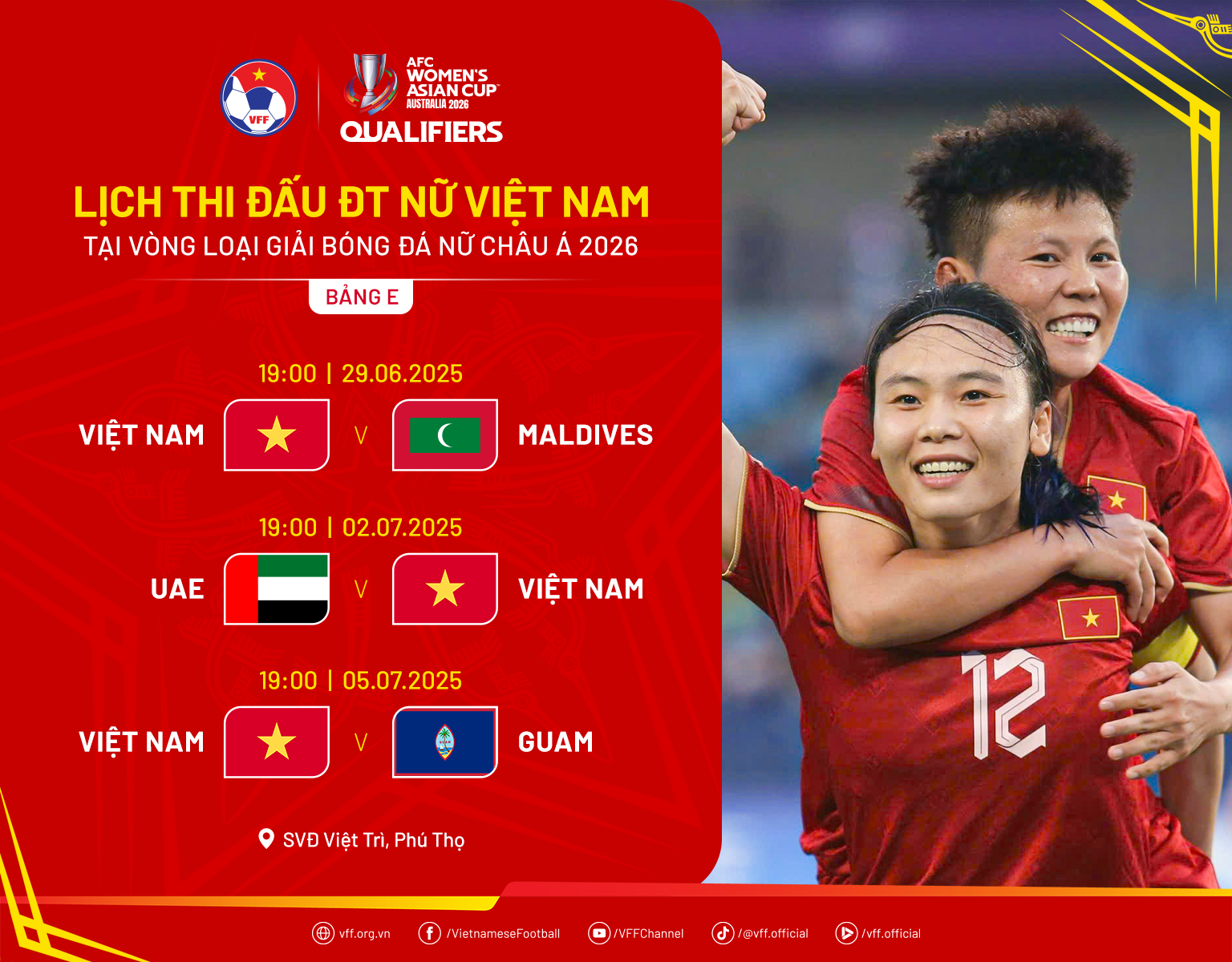 Trong lịch thi đấu được công bố, đội tuyển nữ Việt Nam sẽ có trận ra quân gặp đội tuyển nữ Maldives vào lúc 19h00 ngày 29/06 tới. Tiếp đó, ở lượt trận thứ hai, vào lúc 19h00 ngày 02/07, thầy trò HLV Mai Đức Chung sẽ đối đầu với đối thủ mạnh đến từ Trung Đông - đội tuyển nữ UAE. Tại lượt trận cuối Vòng loại, vào lúc 19h00 ngày 05/07/2025, đội tuyển nữ Việt Nam sẽ thi đấu với đội tuyển nữ Guam.