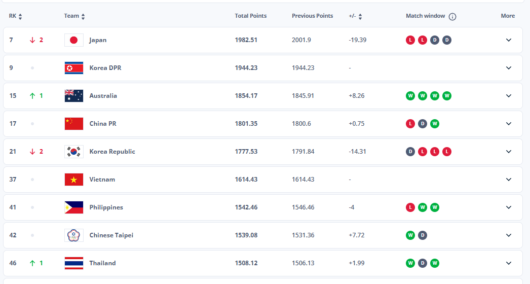 Ở châu Á, đội tuyển nữ Việt Nam xếp ở vị trí thứ 6, sau các đội tuyển nữ Nhật Bản, CHDCND Triều Tiên, Australia, Trung Quốc và Hàn Quốc. Sau 2 trận hòa và 2 trận thua gần đây, đội tuyển nữ Nhật Bản vẫn duy trì vị trí số 1 châu Á nhưng bị tụt 2 bậc xuống vị trí thứ 7 thế giới. Trong khi đó, đội tuyển nữ Hàn Quốc với 1 trận hòa và 3 trận thua gần đây cũng tụt 2 bậc xuống xếp vị trí 21 thế giới và thứ 5 châu Á. Với 4 chiến thắng liên tiếp, đội tuyển nữ Australia tăng 1 bậc lên vị trí 15 thế giới và thứ 3 châu Á.