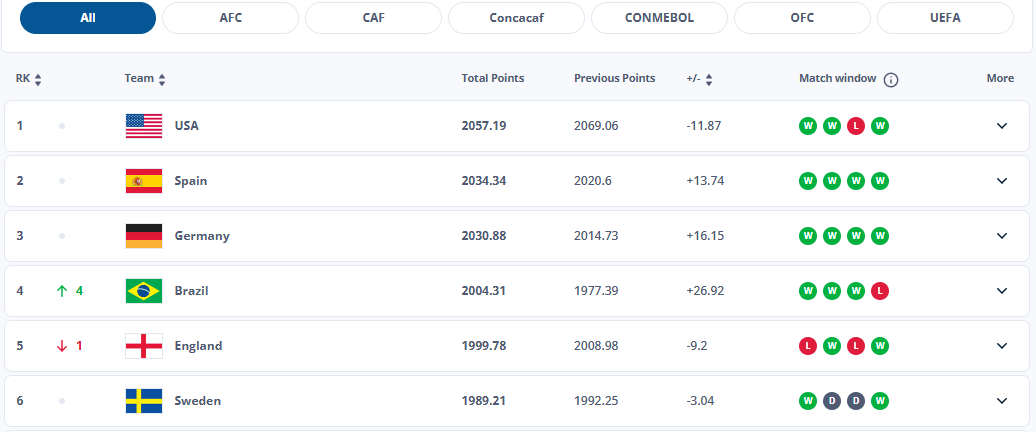 Top 3 đội tuyển nữ thế giới trong bảng xếp hạng FIFA tháng 06/2025 không có gì xáo trộn. Đội tuyển nữ Mỹ tiếp tục giữ ngôi đầu bảng với phong độ ổn định. Đội tuyển nữ Tây Ban Nha - đương kim vô địch thế giới, xếp ở vị trí thứ hai. Đội tuyển nữ Đức đứng thứ ba sau chuỗi 4 trận toàn thắng. Đội tuyển nữ Brazil tăng 4 bậc để lần đầu trở lại Top 4 kể từ năm 2013. Đội tuyển nữ Anh bị hạ 1 bậc, xếp ở vị trí thứ năm.