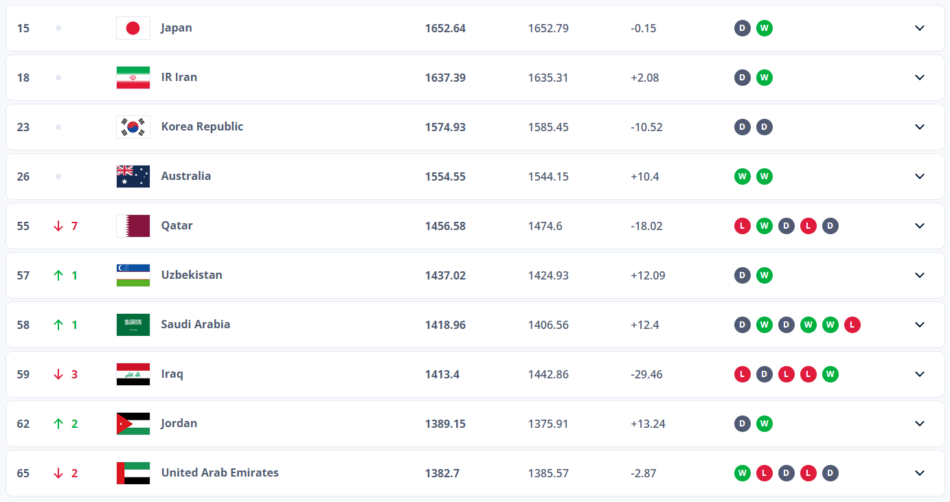 Tại châu Á, 4 vị trí dẫn đầu không có sự thay đổi khi các đội tuyển giữ nguyên thứ hạng. Đứng đầu châu Á vẫn là đội tuyển Nhật Bản - xếp hạng 15 thế giới, xếp thứ nhì là đội tuyển Iran - xếp hạng 18 FIFA, Hàn Quốc xếp vị trí thứ 3 (hạng 23 thế giới) và Australia xếp ở vị trí thứ 4 (hạng 26 thế giới).