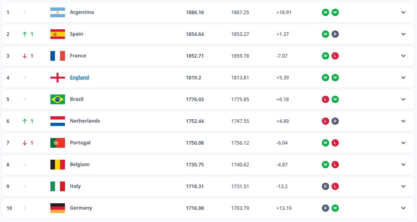 Trên bảng xếp hạng bóng đá thế giới, đội tuyển Argentina vẫn giữ nguyên thứ hạng số một của FIFA. Tây Ban Nha tăng 1 bậc lên xếp vị trí thứ nhì thế giới. Đội tuyển Pháp bị trừ 7,07 điểm, tụt 1 hạng xuống xếp thứ 3 thế giới.