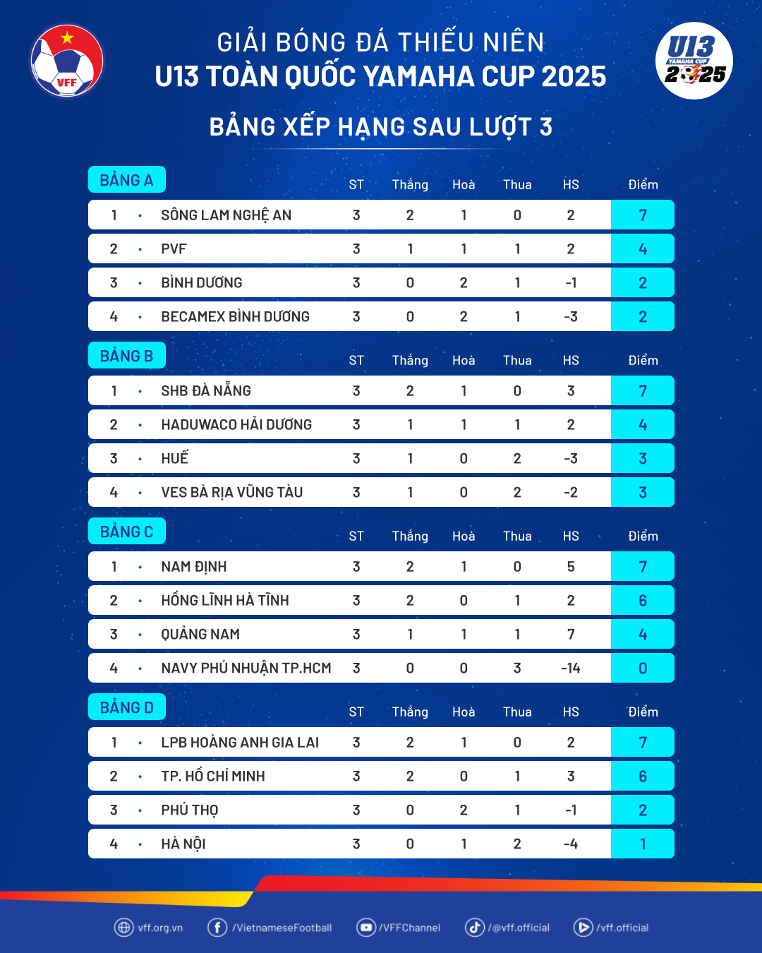 U13 Hồng Lĩnh Hà Tĩnh để tuột ngôi đầu bảng, chấp nhận xếp nhì bảng với 6 điểm có được sau 2 chiến thắng trước đó.