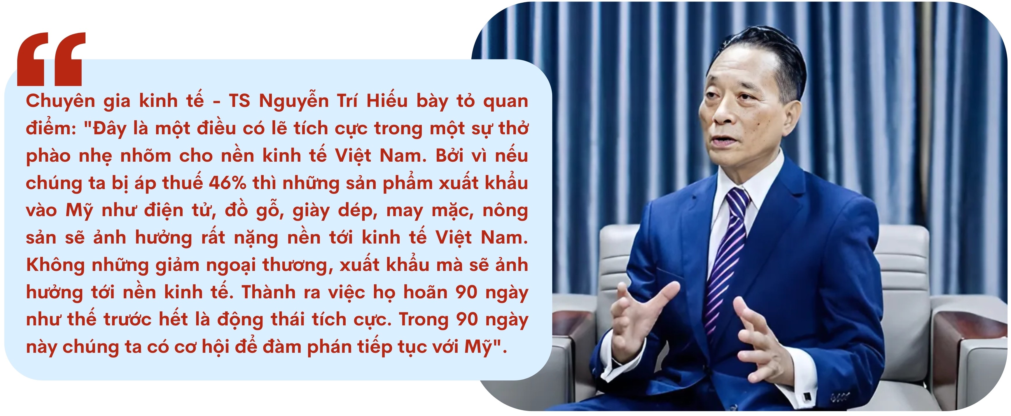 Theo ông Chương, khoảng thời gian “trì hoãn chiến lược” này không chỉ mở ra cơ hội đàm phán mà còn giúp Việt Nam chuẩn bị đầy đủ các kịch bản ứng phó, đánh giá toàn diện tác động kinh tế nếu Mỹ thực sự tiến hành áp thuế trên phạm vi toàn cầu, trong đó có Việt Nam.