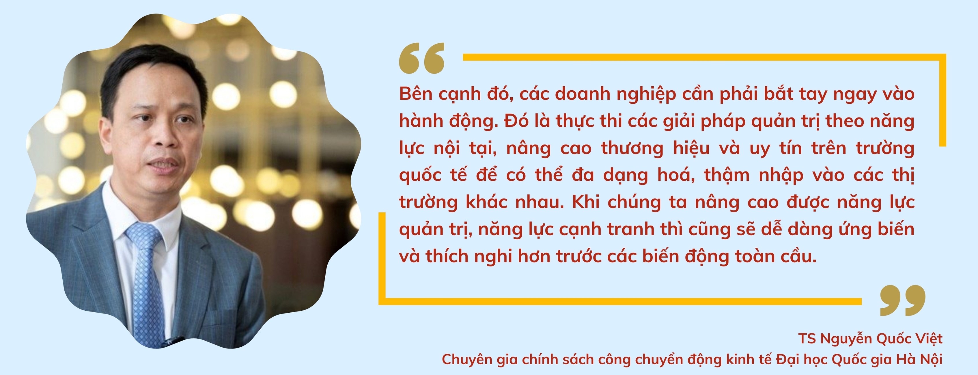 Do đó, TS Nguyễn Quốc Việt, chuyên gia chính sách công chuyển động kinh tế - Đại học Quốc gia Hà Nội, khuyến nghị các doanh nghiệp cần có sự đồng lòng hợp tác với các cơ quan nhà nước; với các ngành hàng, các doanh nghiệp trong cùng chuỗi cung ứng để đạt được sự tin cậy, chia sẻ rủi ro và hài hoà lợi ích.