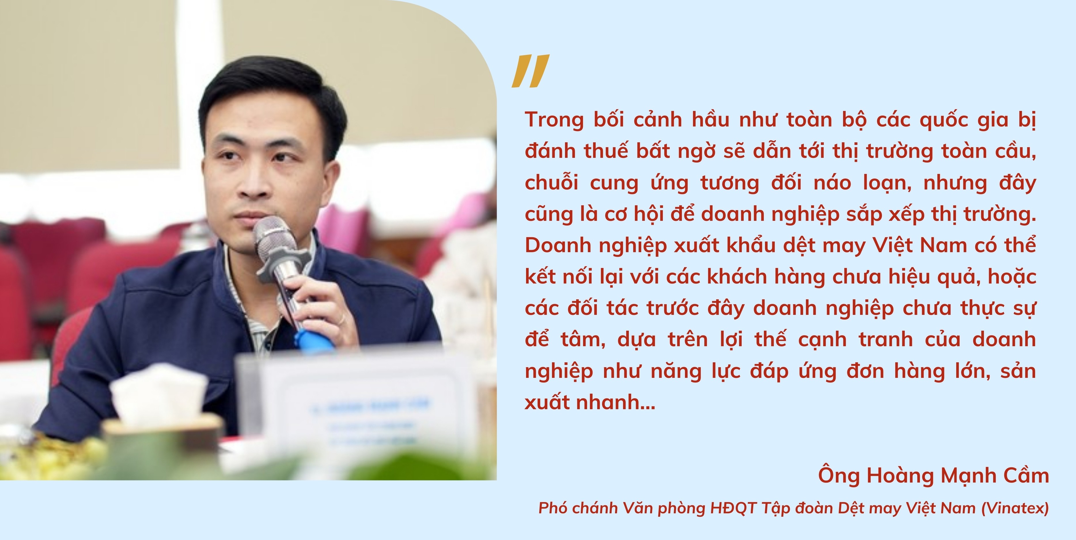 Đối với doanh nghiệp dệt may, theo ông Hoàng Mạnh Cầm, Phó chánh Văn phòng HĐQT Tập đoàn Dệt may Việt Nam (Vinatex), dù Mỹ đã hoãn áp thuế đối ứng 46% trong 90 ngày, nhưng vẫn áp thuế bổ sung 10%. Như vậy, hàng may mặc Việt Nam vào Mỹ sẽ chịu tổng mức thuế khoảng 28% (gồm 18% MFN và 10% bổ sung), gây áp lực lớn lên xuất khẩu.