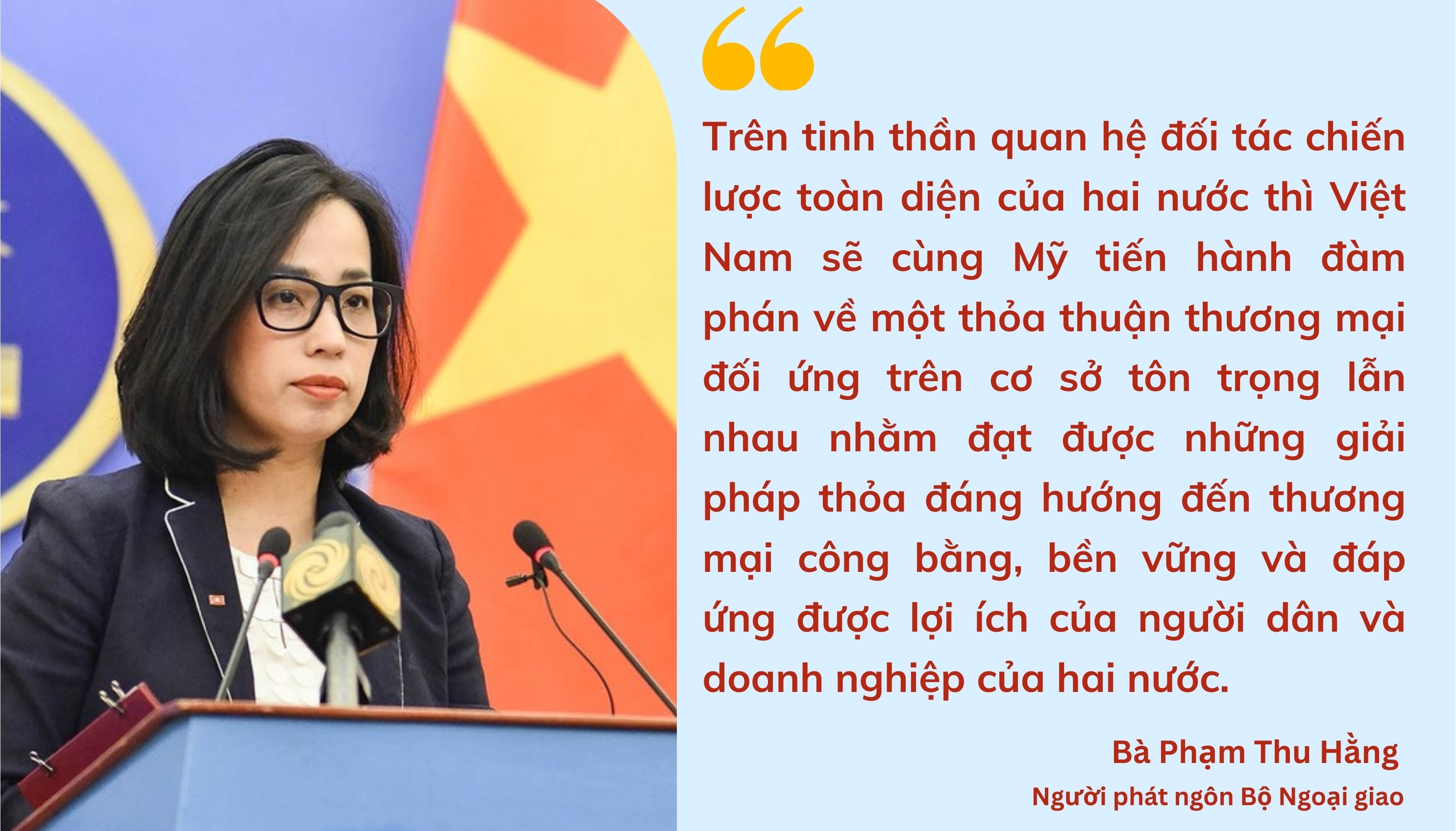 Tại cuộc họp báo thường kỳ Bộ Ngoại giao diễn ra ngày 10/4, Người phát ngôn Bộ Ngoại giao Phạm Thu Hằng cho biết, quyết định của Mỹ là một bước đi tích cực. Theo bà Hằng, trên tinh thần quan hệ đối tác chiến lược toàn diện của hai nước, Việt Nam sẽ cùng Mỹ tiến hành đàm phán về một thỏa thuận thương mại đối ứng trên cơ sở tôn trọng lẫn nhau nhằm đạt được những giải pháp thỏa đáng hướng đến thương mại công bằng, bền vững và đáp ứng được lợi ích của người dân và doanh nghiệp của hai nước.