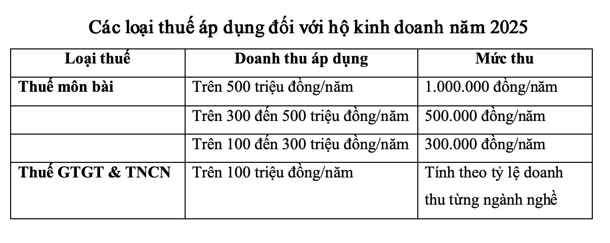 Thuế môn bài được xác định theo doanh thu từng năm: hộ có doanh thu trên 500 triệu đồng/năm nộp 1 triệu đồng; doanh thu từ trên 300 đến 500 triệu đồng/năm nộp 500.000 đồng; doanh thu từ trên 100 đến 300 triệu đồng/năm nộp 300.000 đồng.