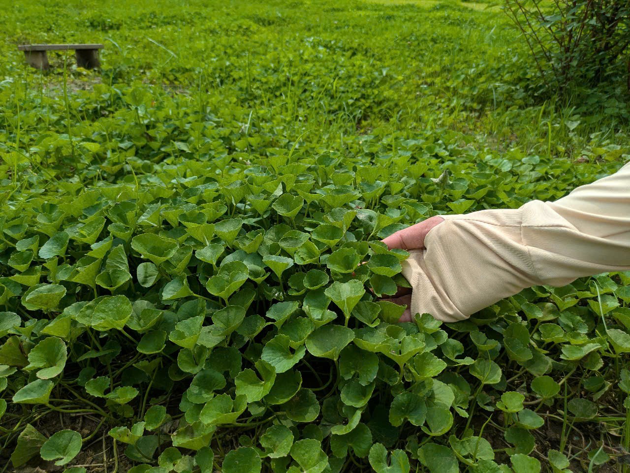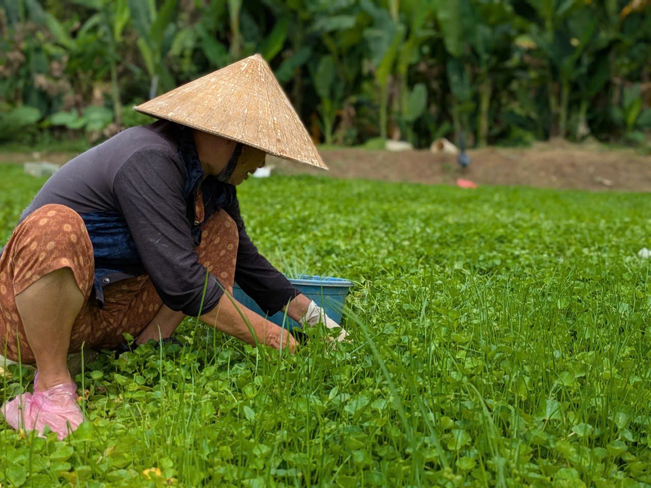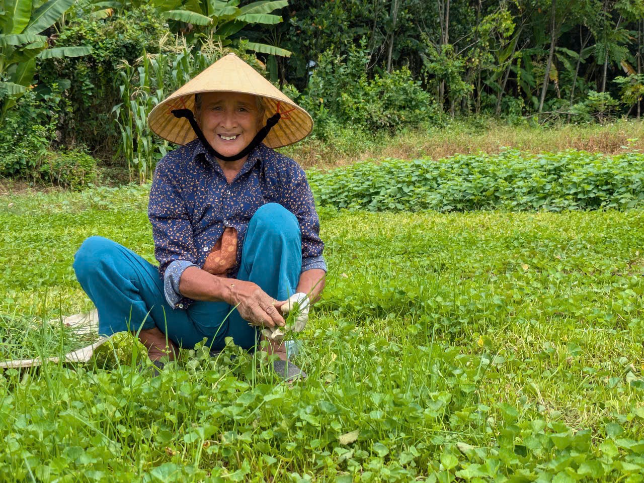 Với đặc tính dễ sống, rau má nơi đây mọc nhanh thành từng khóm, len lỏi xuống cả những thửa ruộng của bà con, như thể bám rễ vào lòng đất quê hương. Cũng giống như tình làng nghĩa xóm gắn bó keo sơn, loài rau dân dã này đã hiện diện âm thầm mà bền bỉ suốt bao đời.