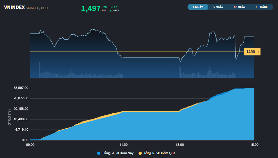 Kết phiên, VN-Index tăng 7,27 điểm lên 1.497,28 điểm (+0,49%). Tổng giá trị giao dịch toàn sàn đạt 35.633 tỷ đồng, tương đương 1.487 triệu đơn vị.