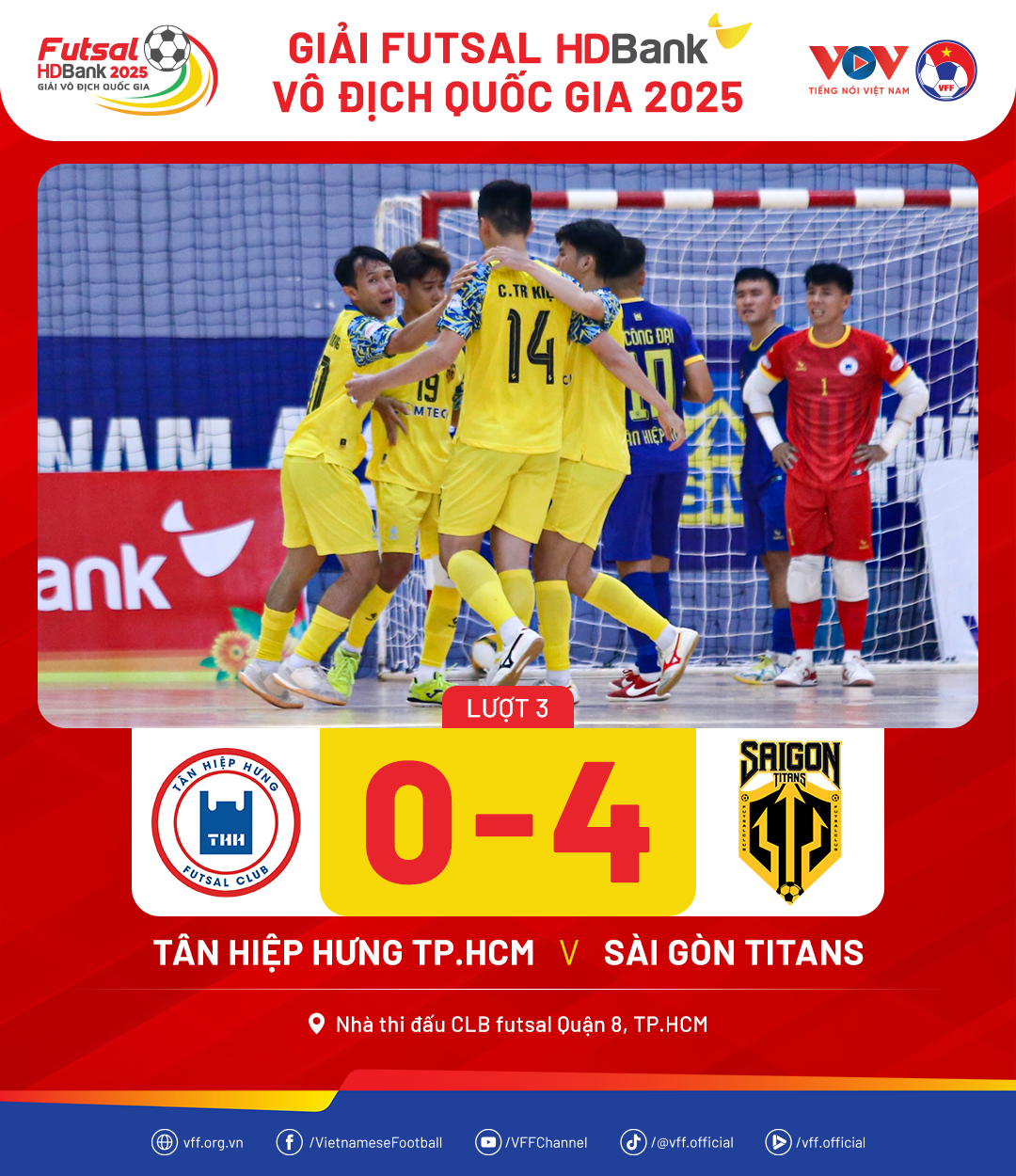 Trong trận đấu tiếp theo của lượt 3, câu lạc bộ Sài Gòn Titans đã giành chiến thắng đậm 4-0 trước Tân Hiệp Hưng TP. Hồ Chí Minh. Qua đó, Sài Gòn Titans tiếp tục vững vàng ở vị trí thứ hai trên bảng xếp hạng, trở thành một đối thủ lớn của Thái Sơn Nam TP. Hồ Chí Minh trong cuộc đua đến ngôi vô địch.