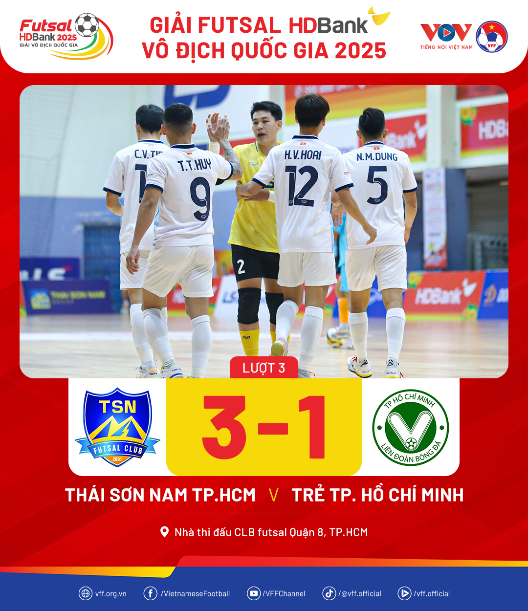 Trong khi đó, ở trận đấu cuối cùng của lượt trận thứ 3, nhà đương kim vô địch Thái Sơn Nam TP. Hồ Chí Minh tiếp tục duy trì thành tích bất bại kể từ đầu mùa giải khi vượt qua câu lạc bộ Trẻ TP. Hồ Chí Minh với tỉ số 3-1.