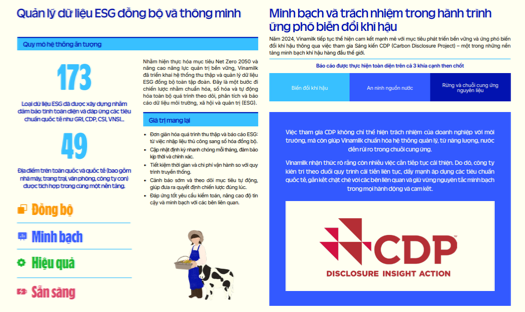 Cụ thể, Vinamilk đang triển khai phần mềm quản lý dữ liệu ESG và khí nhà kính xuyên suốt toàn hệ thống, giúp truy xuất dữ liệu kịp thời, dự báo xu hướng và đảm bảo tính toàn vẹn, bảo mật. Đây là bước đi quan trọng để xây dựng bức tranh phát thải rõ ràng, từ đó có lộ trình giảm phát thải hiệu quả và minh bạch. Hệ thống dữ liệu ESG tập đoàn cũng giúp Vinamilk quản trị bền vững minh bạch và theo thời gian thực (real-time).
