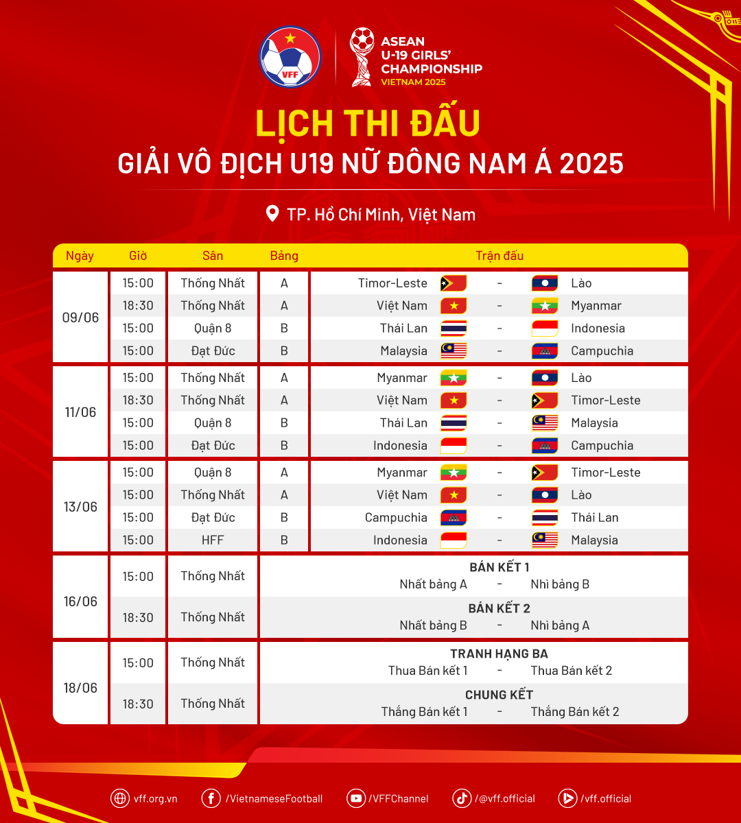Ở Bảng B, U19 nữ Campuchia sẽ gặp U19 nữ Thái Lan trên sân vận động Đạt Đức. U19 nữ Indonesia sẽ đối đầu với U19 nữ Malaysia trên sân vận động HFF./.