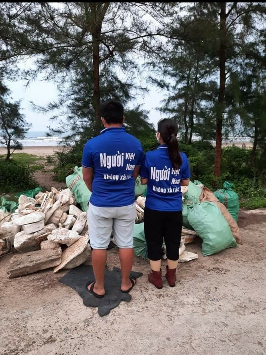 Không những thế, vợ chồng chị Mai còn đặt một số áo in dòng chữ với thông điệp: "Người Việt Nam không xả rác" cho mình và nhóm thiện nguyện mặc mỗi lần than gia nhặt rác để lan tỏa ý thức, trách nhiệm bảo vệ môi trường xung quanh.