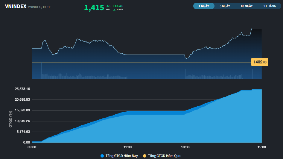 Chốt phiên, VN-Index tăng 13,4 điểm lên 1.415,46 điểm (+0,96%). Thanh khoản sàn đạt 27.975 tỷ đồng, tương đương 1.211 triệu đơn vịl