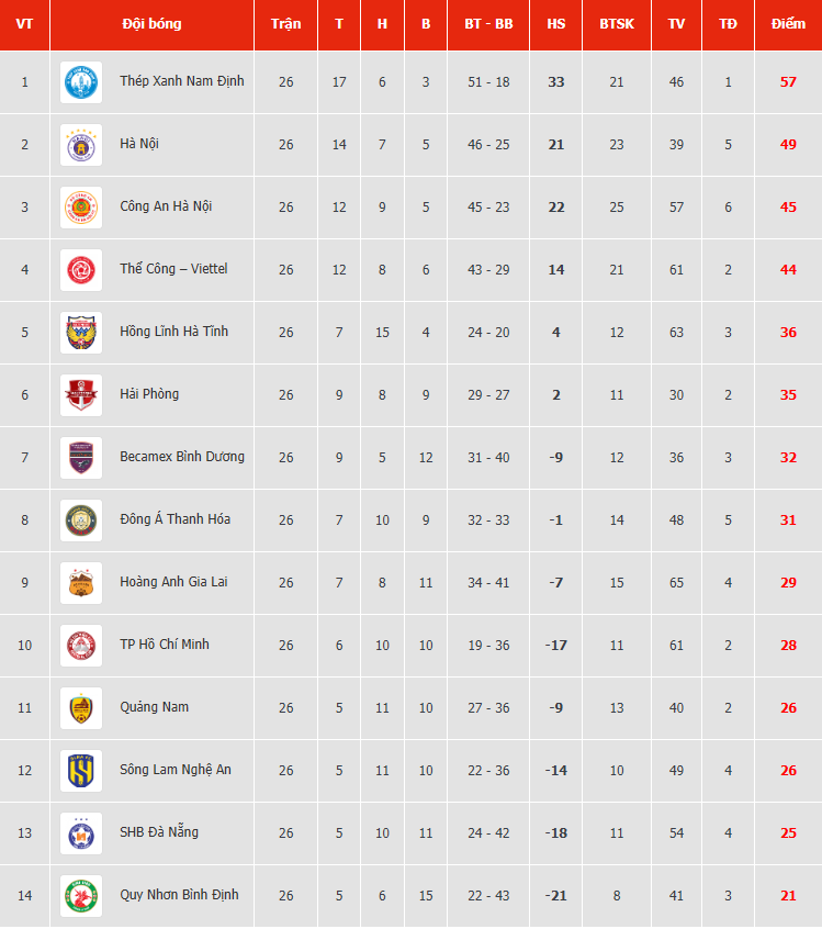 Sau 25 vòng đấu, Nam Định có được 54 điểm, hiệu số bàn thắng bại +32, bỏ xa đội đang xếp nhì bảng là CLB Hà Nội, đội mới có được 46 điểm sau vòng 25. CLB Hà Nội đã để thua Thể Công Viettel trong trận derby bóng đá Thủ đô với tỉ số 1-2 ngay trên sân nhà Hàng Đẫy.