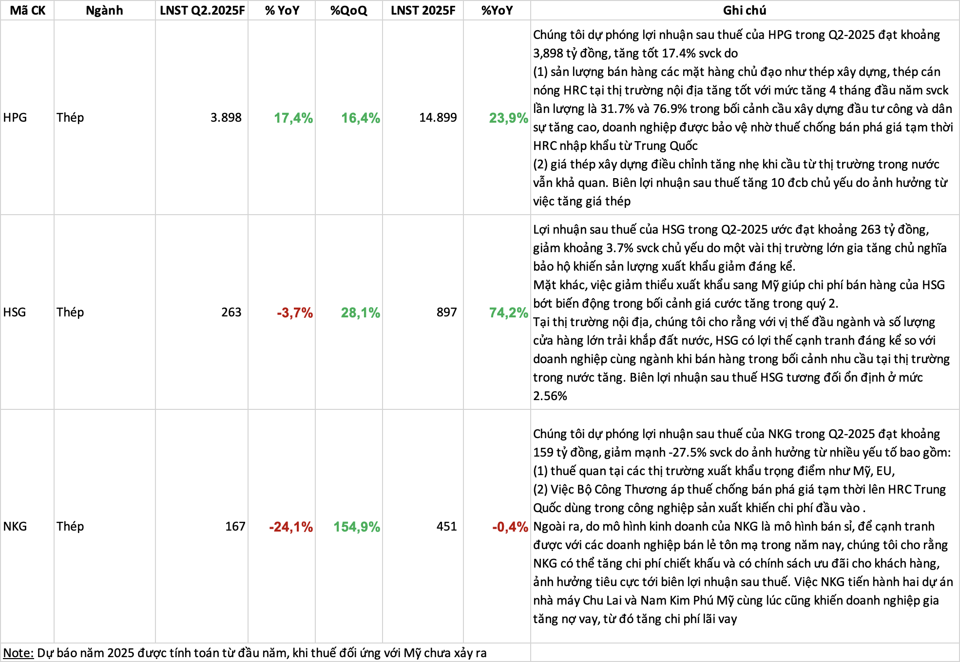 Với Hòa Phát, NHSV dự phóng lợi nhuận sau thuế của doanh nghiệp này trong quý 2/2025 đạt khoảng 3.898 tỷ đồng, tăng trưởng 17,4% so với cùng kỳ (svck) nhờ giá thép xây dựng điều chỉnh tăng nhẹ khi cầu từ thị trường trong nước vẫn khả quan. Biên lợi nhuận sau thuế tăng 10 điểm cơ bản chủ yếu do ảnh hưởng từ việc tăng giá thép.