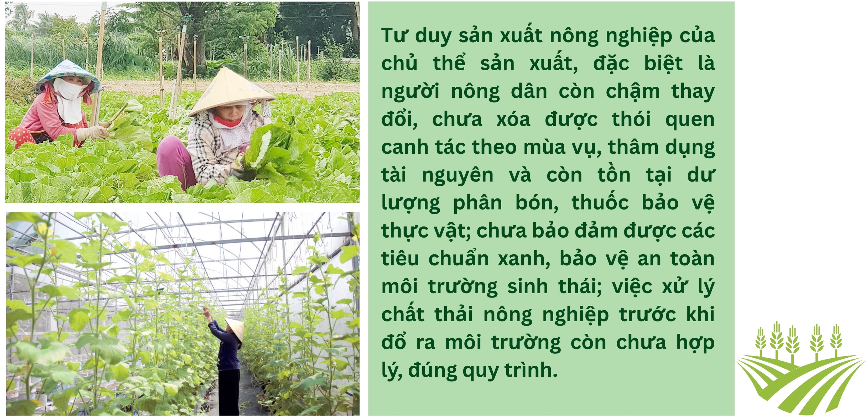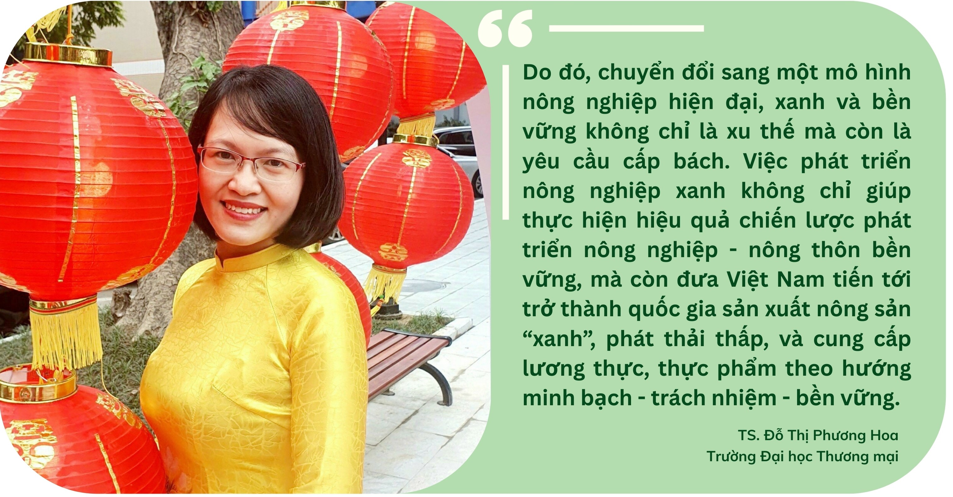 Theo TS. Hoa, có nhiều nguyên nhân khiến nền nông nghiệp Việt Nam còn nhiều hạn chế cần phải khắc phục trước yêu cầu phát triển nông nghiệp xanh. Thứ nhất, nhận thức và kiến thức của nông dân còn hạn chế. Họ chưa hiểu rõ khái niệm và lợi ích của nông nghiệp xanh, vẫn canh tác theo kinh nghiệm, lạm dụng phân bón, thuốc trừ sâu và chưa áp dụng kỹ thuật hữu cơ hay bảo vệ môi trường hiệu quả.