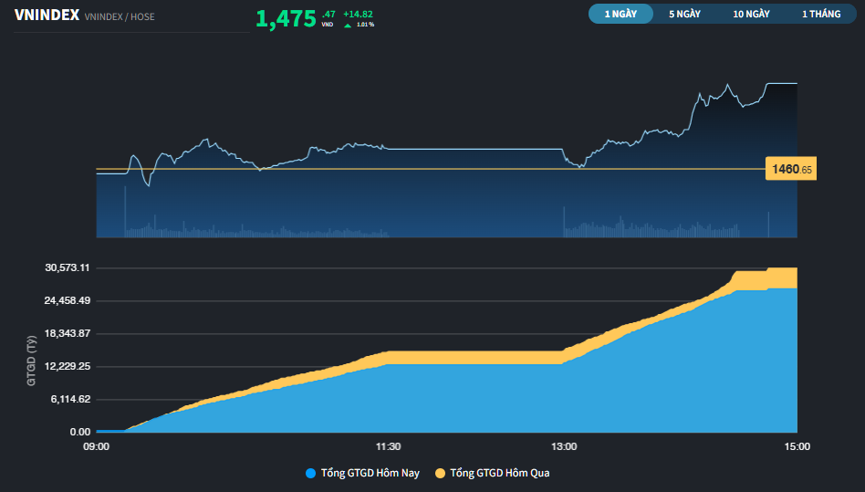 Dư âm của hoạt động chốt lời chỉ diễn ra đầu phiên sáng. Sau đó, thị trường chung đã nhanh chóng đảo chiều và duy trì sắc xanh cho đến kết phiên. Trạng thái đóng cửa chỉ số VN-Index cũng là cao nhất phiên, tăng 14,82 điểm lên 1.475,47 điểm (+1,01%). Thanh khoản sàn đạt 1.346,07 triệu đơn vị, tương đương 32.624 tỷ đồng.