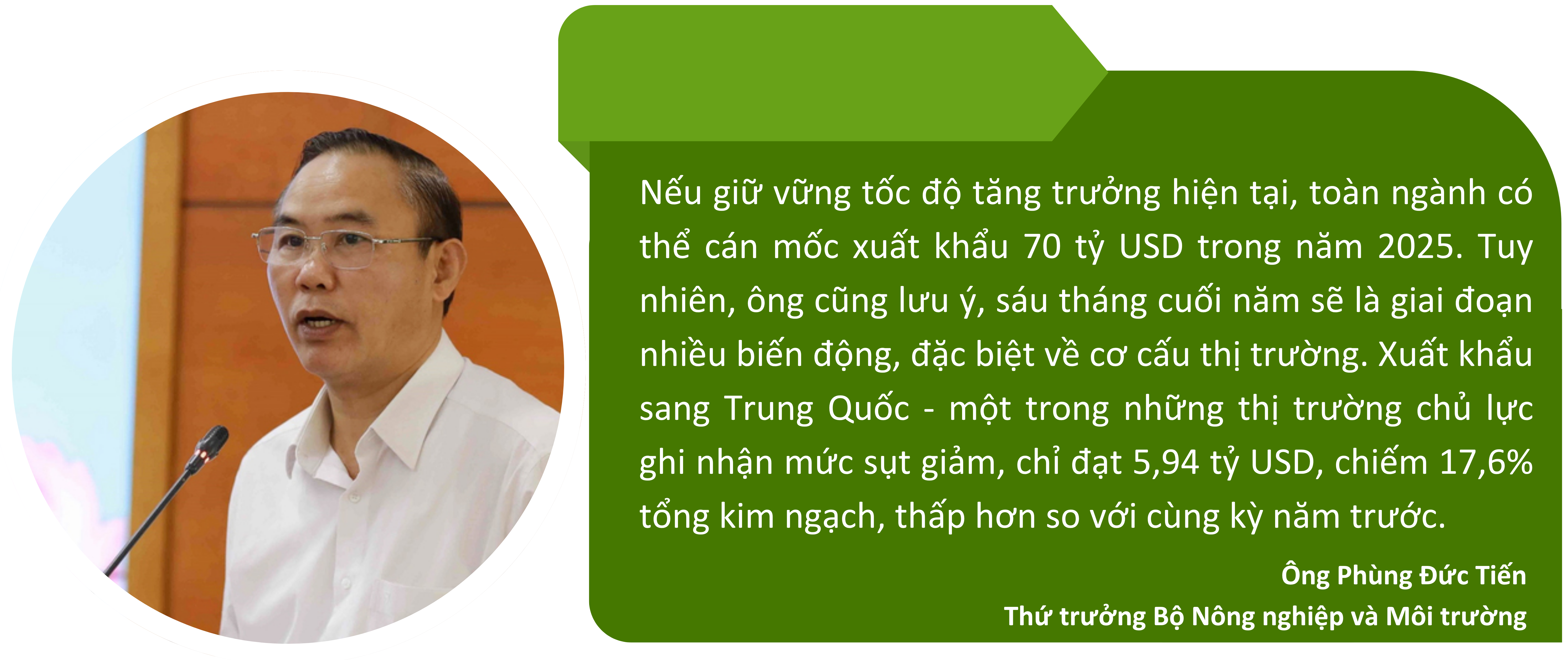 Trước bối cảnh này, Thứ trưởng Bộ Nông nghiệp và Môi trường Phùng Đức Tiến nhận định: nếu giữ vững tốc độ tăng trưởng hiện tại, toàn ngành có thể cán mốc xuất khẩu 70 tỷ USD trong năm 2025. Tuy nhiên, ông cũng lưu ý, sáu tháng cuối năm sẽ là giai đoạn nhiều biến động, đặc biệt về cơ cấu thị trường. Xuất khẩu sang Trung Quốc - một trong những thị trường chủ lực ghi nhận mức sụt giảm, chỉ đạt 5,94 tỷ USD, chiếm 17,6% tổng kim ngạch, thấp hơn so với cùng kỳ năm trước.